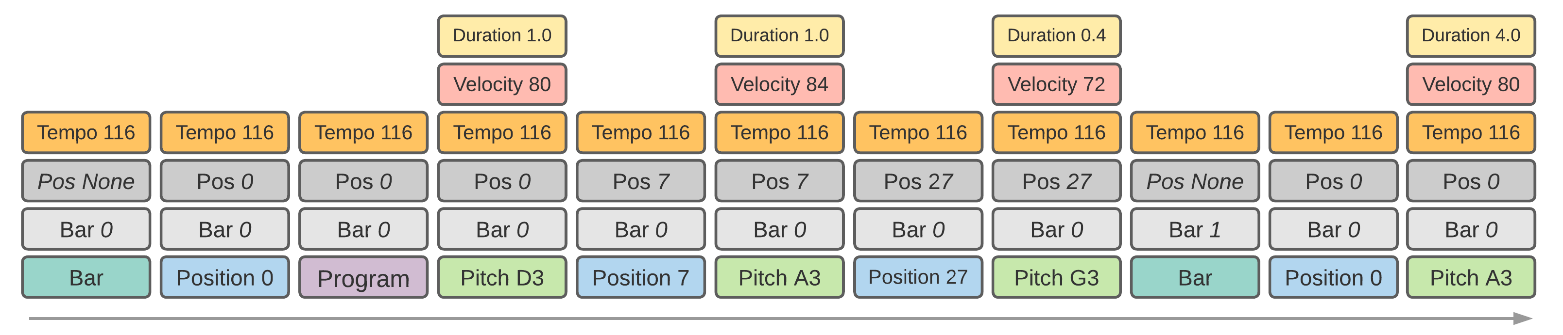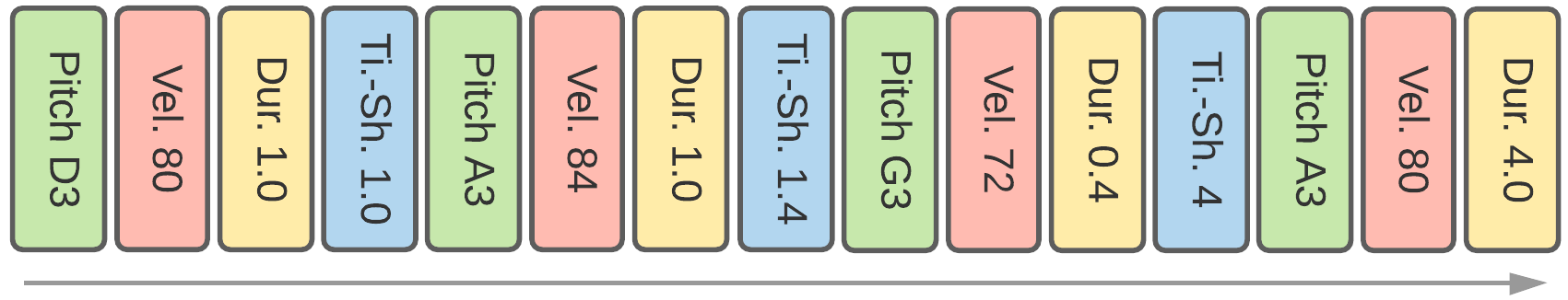 Introduced with the Piano Inpainting Application, it is similar to TSD but is based on a consistent token type successions. Token types always follow the same pattern: Pitch -> Velocity -> Duration -> TimeShift. The latter is set to 0 for simultaneous notes. To keep this property, no additional token can be inserted in MidiTok’s implementation, except Program that can optionally be added preceding