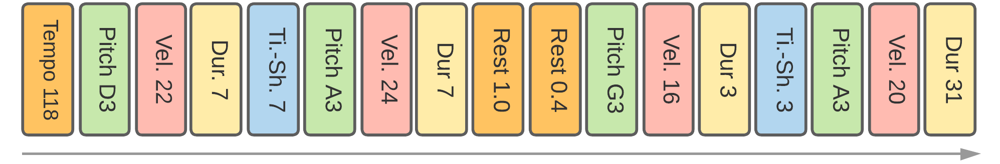 - As the time signature is carried simultaneously with the note tokens, if a Time
